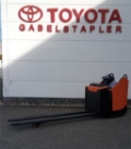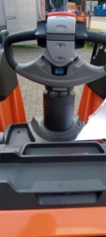 Plattform manuell hochklappbar, feste Seitenschutzwände mit schmalem Deichselgriff, kurzer Deichselarm, Servolenkung, 12,5 km/h Version, Gabelrollen Tandem, Stützrad Einfach- Premium, Antriebsrad - Premium, PIN-Code