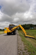 Deze zware armklepelmaaier is geschikt voor trekkers vanaf 150 pk, maar belangrijker is een minimaal gewicht van 8500kg en een CAT 3 hef. De klepelarm is uniek in zijn soort door zijn aandrijving, bereik en werkbreedte. Ook kan de klepelarm hydraulisch naar achteren draaien dat tevens de aanrijbeveiliging is. De aandrijving van de klepelbak gebeurd met de 1000rpm aftakas, er zitten 3 zware automatisch gespannen V-snaren naast elkaar langs de giek aan beiden kanten. Deze brengen de pk's van de trekker zo rechtstreeks naar de klepelbak met minimaal verlies, geen hydrauliekpompen en/of motoren. Het bewegen van de machine gebeurd door 4 dubbelwerkende ventielen rechtstreeks op de trekker, dus geen extra elektronica en/of ventielenblokken. Er zit hydraulische bodemdruk ontlasting op door middel van een accumulator die je onder druk zet. De machine is uit te voeren met een 2,1m brede hamer klepelbak of een 2,1m brede ketting maaier. Voordelen van de ketting maaier zijn met moeiteloos omver maaien van dik opschot, geen zuigende werking zoals een klepelbak en geen scherpe messen. Het voordeel van een klepelbak is dat hij netter werk levert. Door het contragewicht van 700kg hangt de machine stabiel achter de trekker zonder extra stabilisatie. Het bereik is 7,2m vanuit het hart van de trekker tot de buitenkant van de klepelbak. Een super combinatie met de 5,2m front uitvoering. Er is ook nog een 5,2m achter uitvoering.